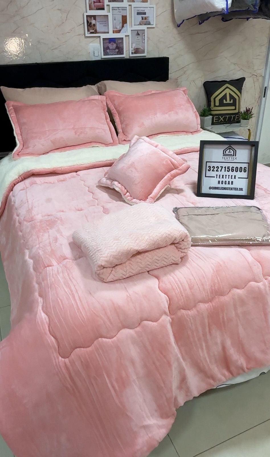 El combo te incluye juego de edredón de lujo suave y cálido en piel de conejo sintética con ovejero marfil por el otro lado; con 2 cojines rellenos y 2 fundas de almohadas (para cama sencilla incluye 1 funda y 1 cojin), juego de sábanas y una cobija unifaz.