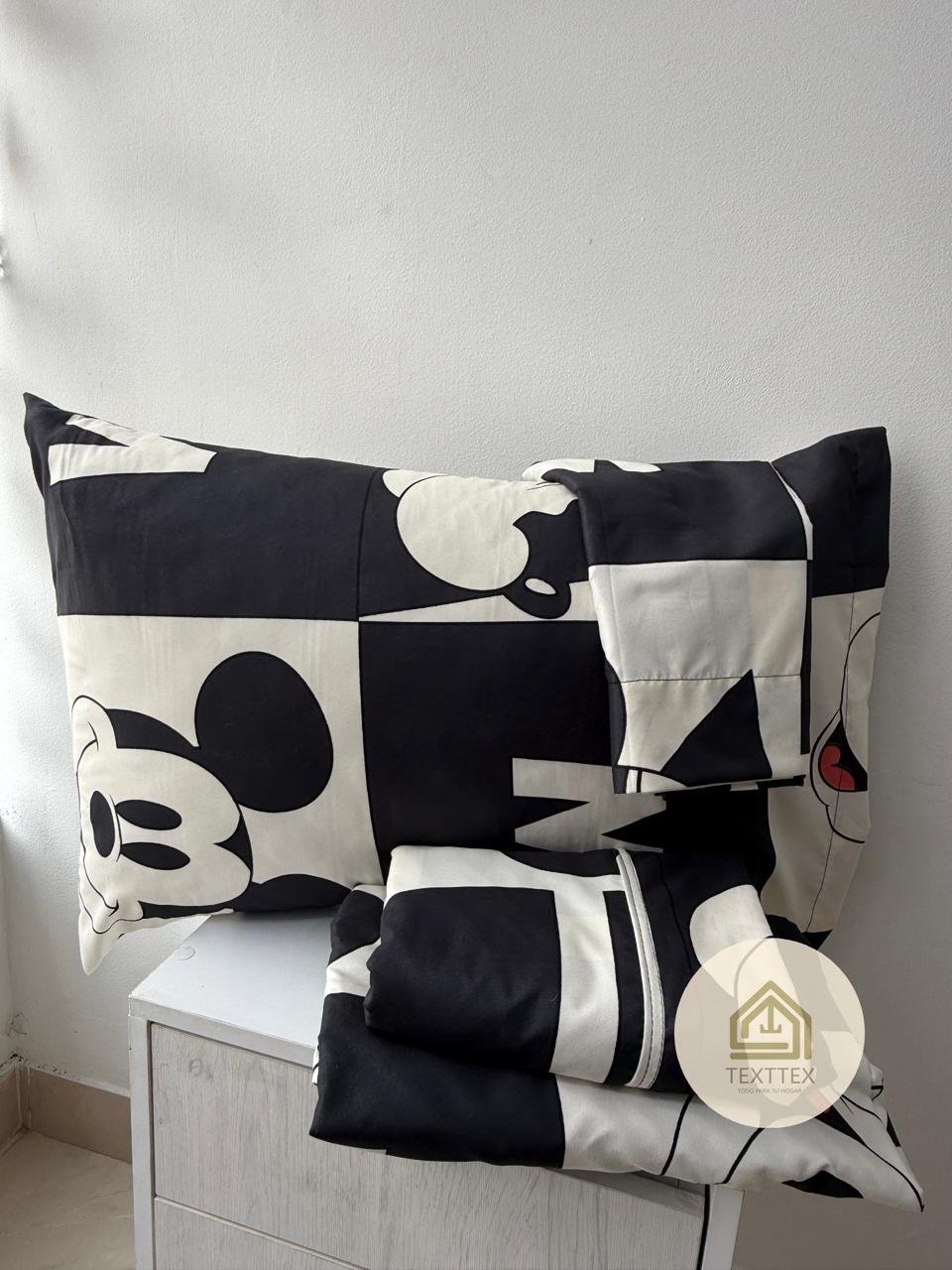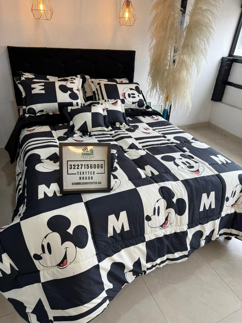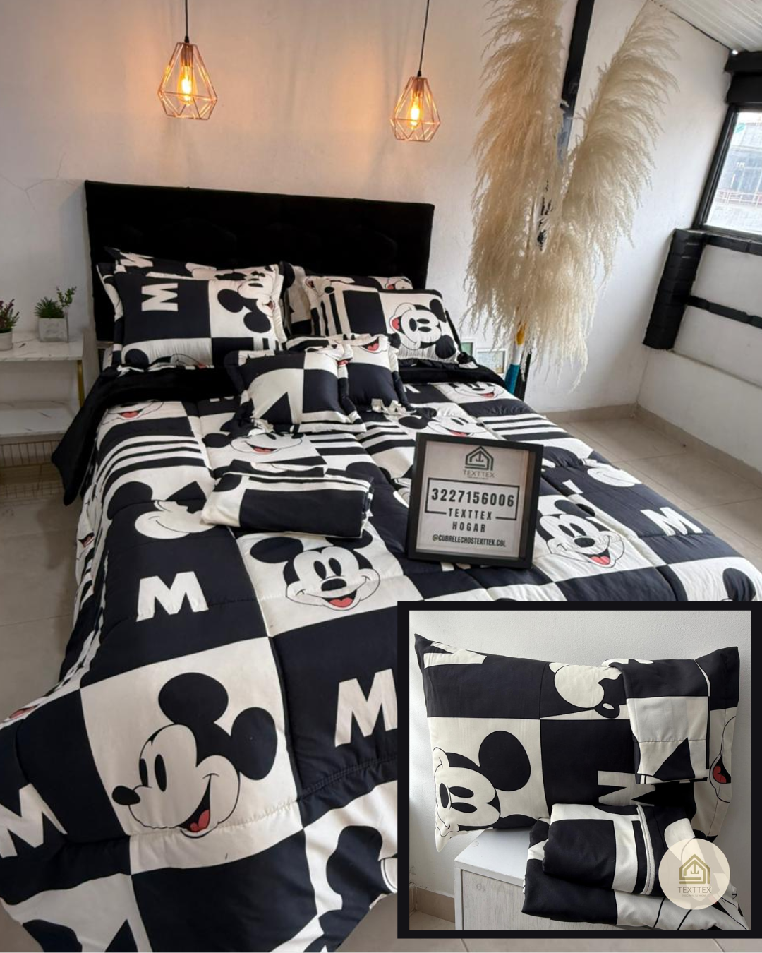 Edredón doble faz tela por un lado diseño mickey y cobija negra por el otro lado, adicional incluye un juego de sábanas en tela de 90gms, mucho más suave y resistente.