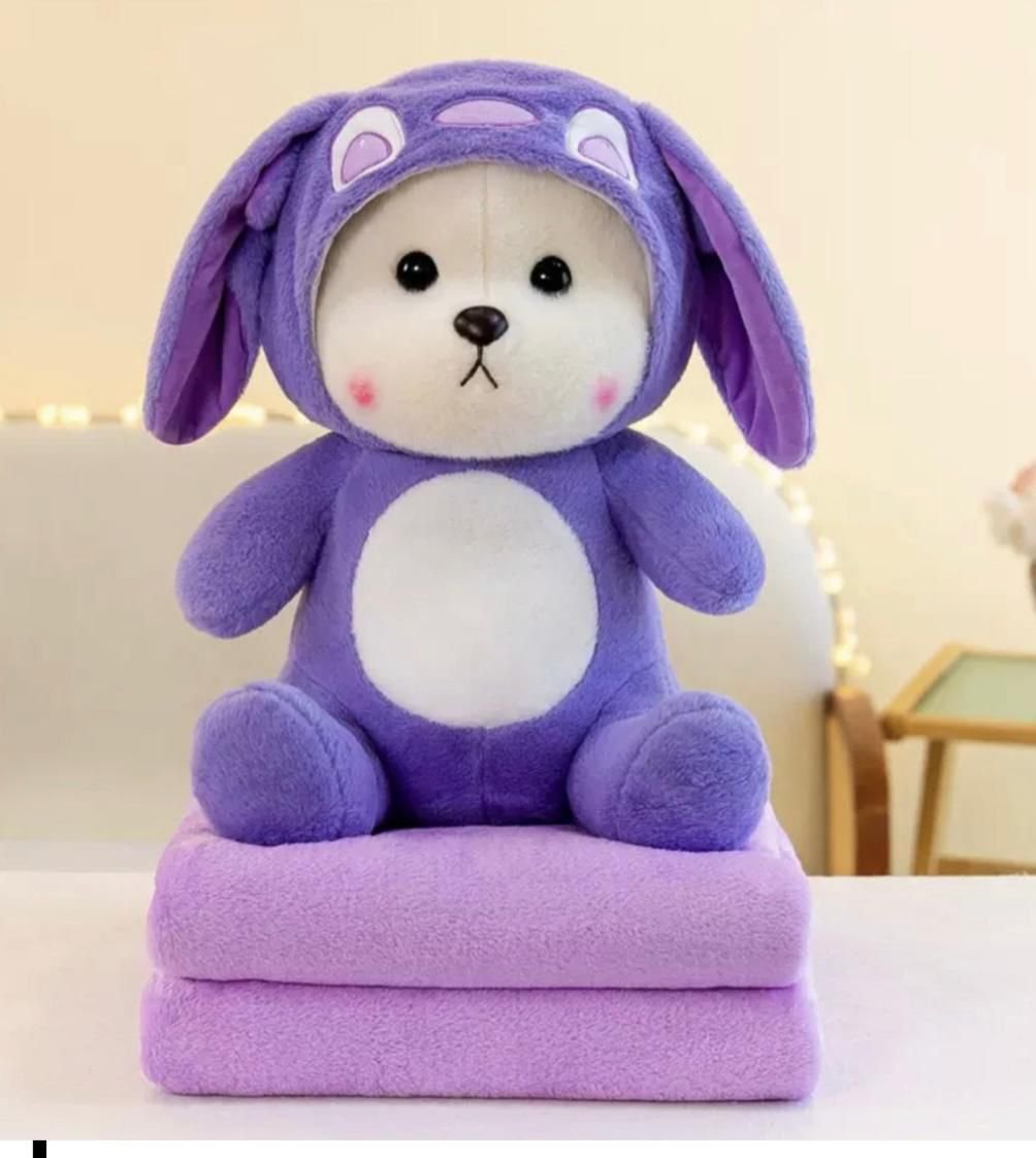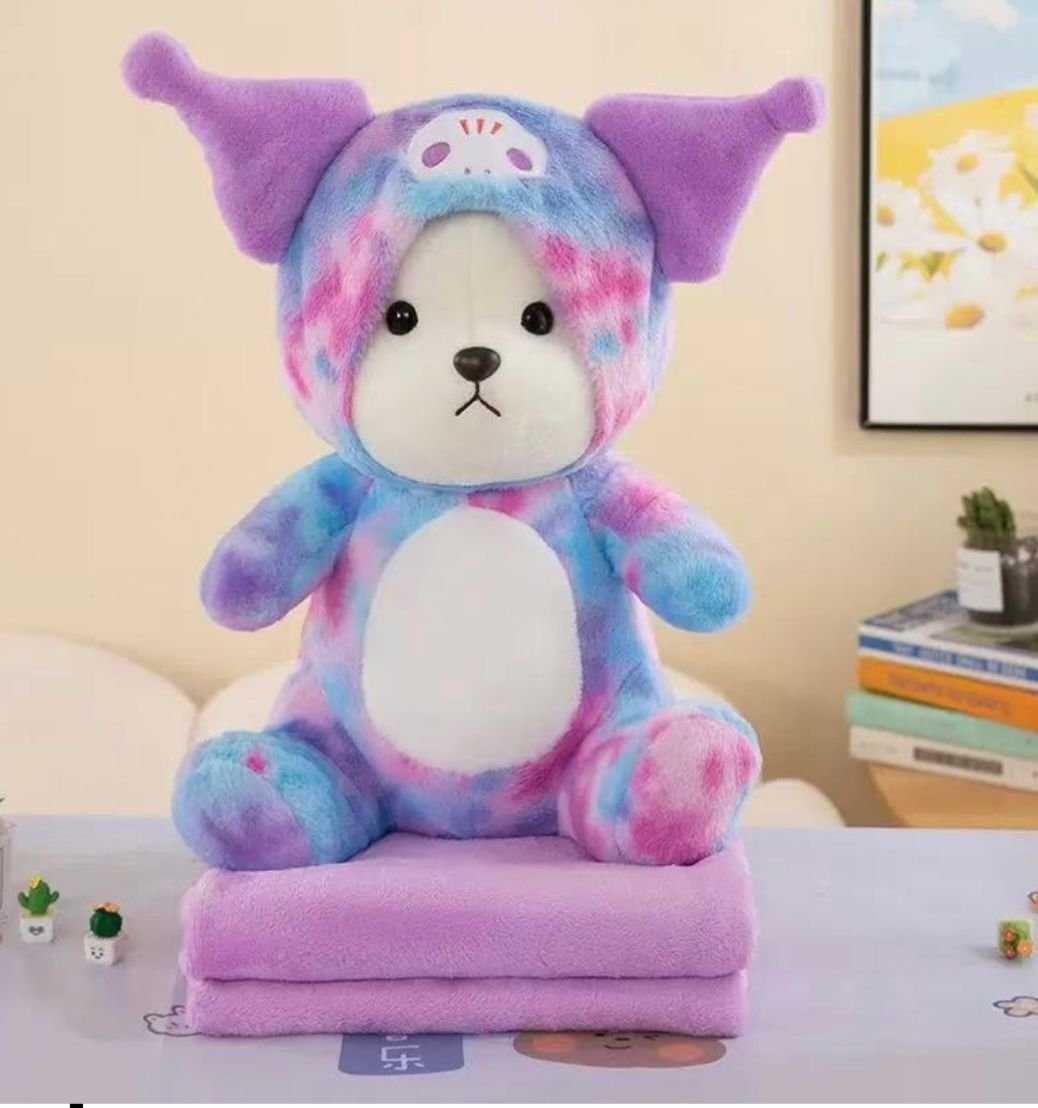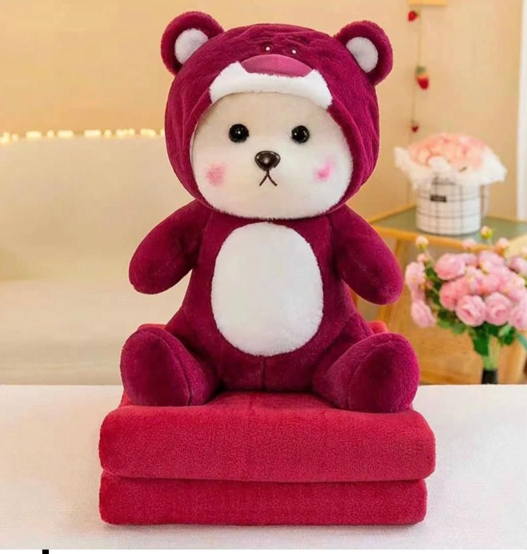 ¡Elige tu favorito y abrígate con estilo! Estos hermosos peluches traen una manta térmica de 1.10 x 1.60 metros guardada en su espalda.