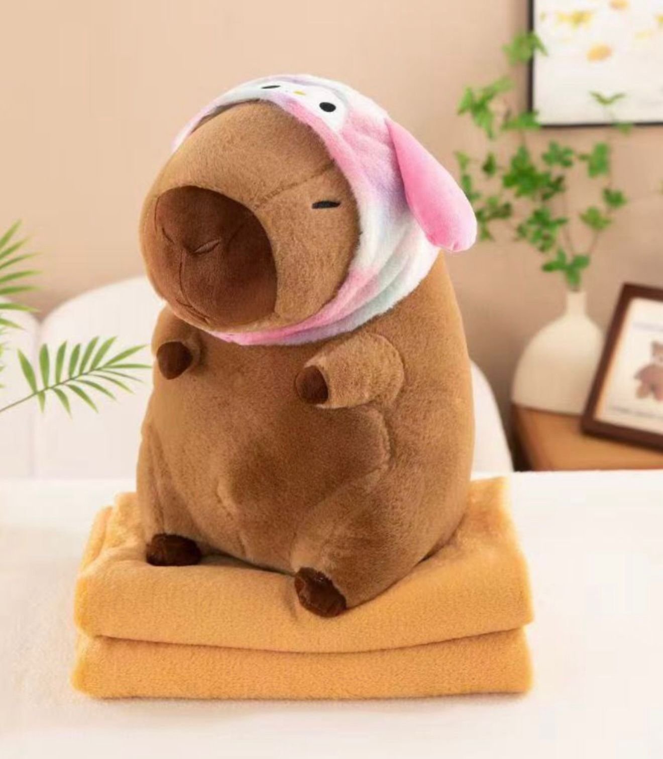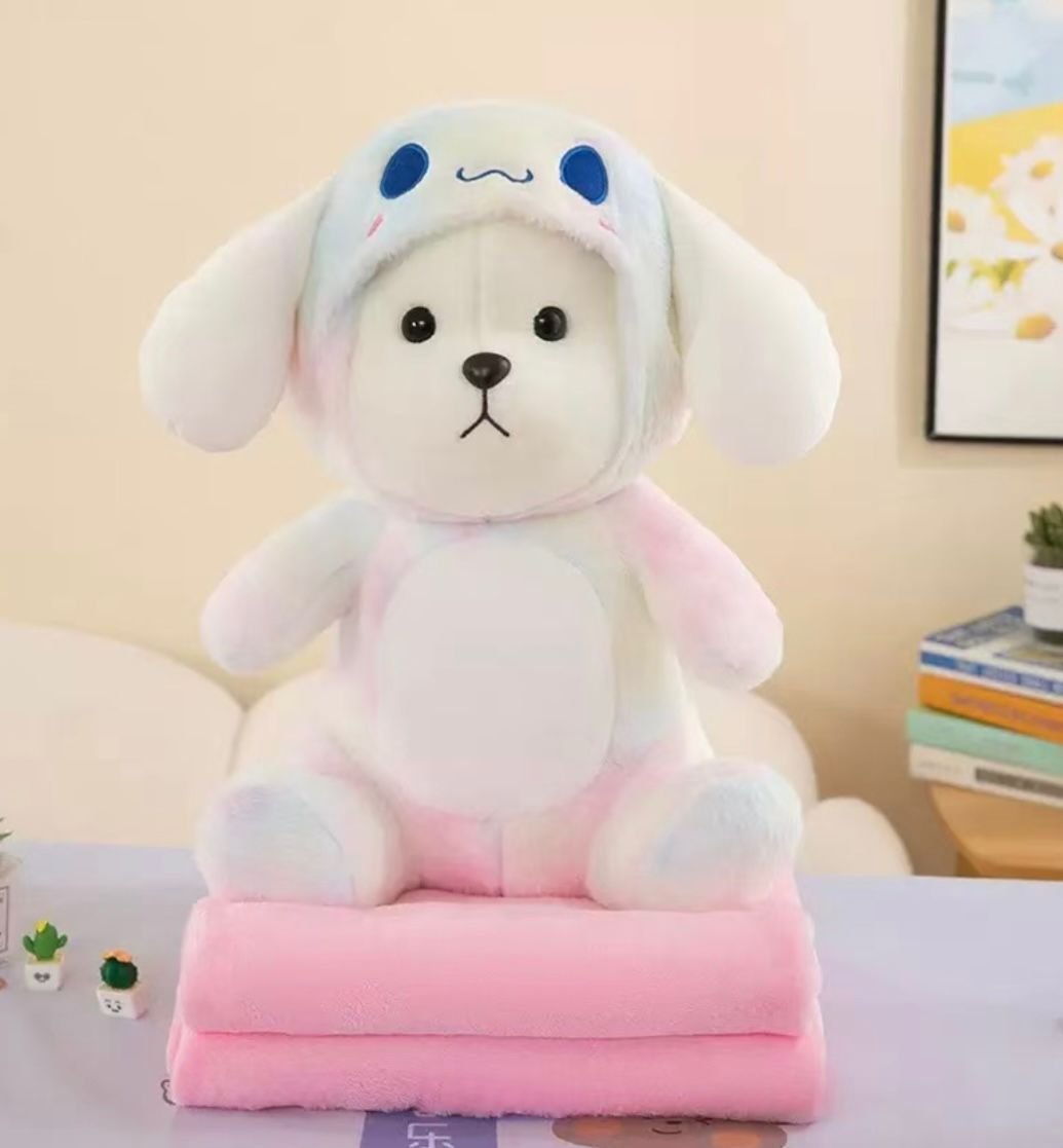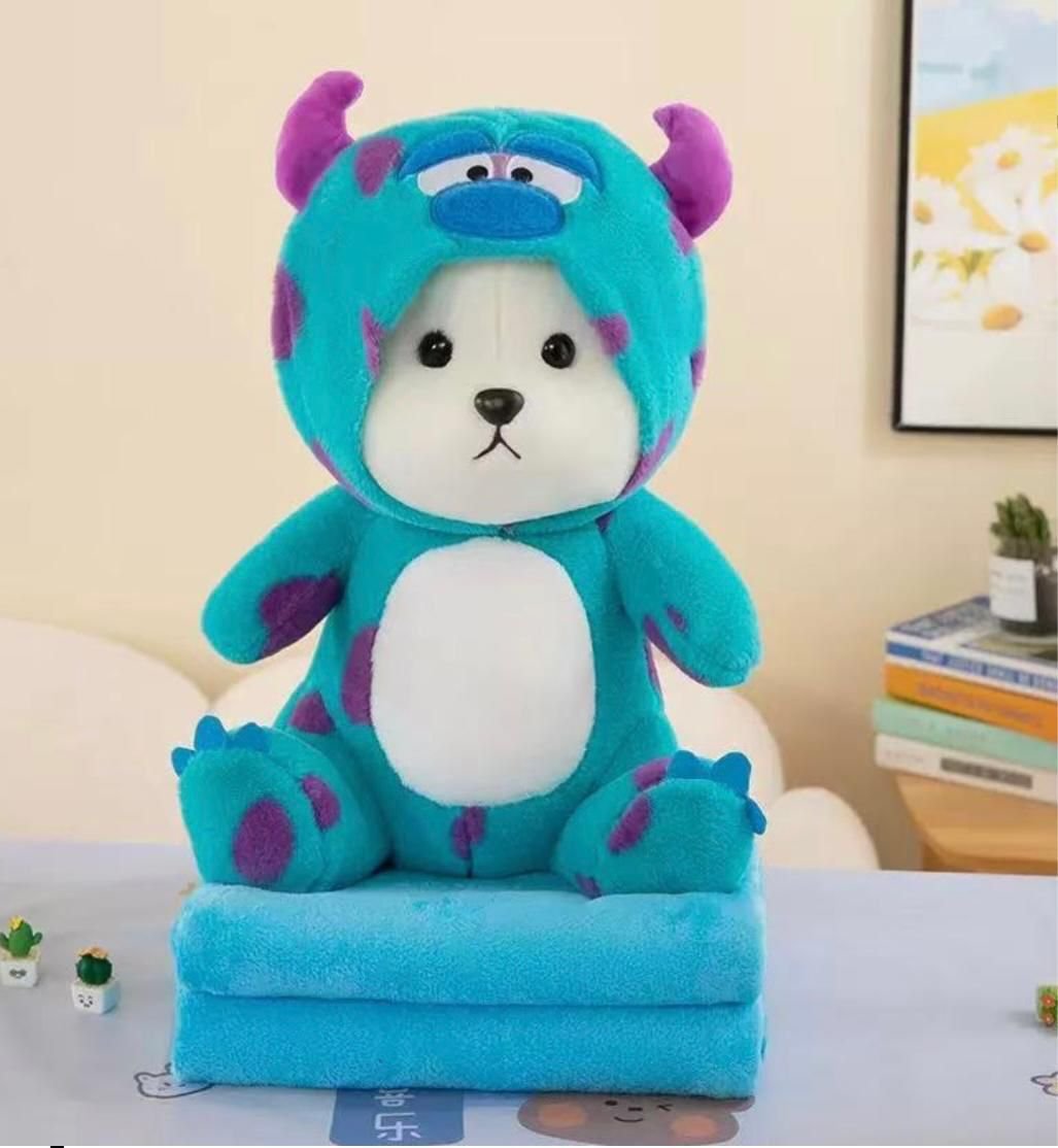 ¡Elige tu favorito y abrígate con estilo! Estos hermosos peluches traen una manta térmica de 1.10 x 1.60 metros guardada en su espalda.